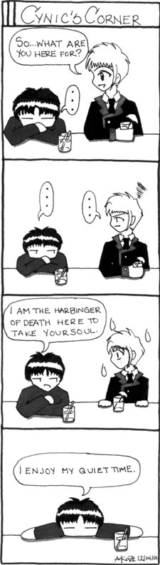 Farewell Came All Too Soon :: Or not soon enough, if you ask him. The final comic ever drawn. I'm supposed to be doing more of them, but we'll see if I stick to that plan or abandon it like Subaru did Kamui in Wankage. Oh! and cynic in a 3/4 profile, the first and only. ...yay.