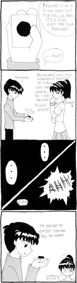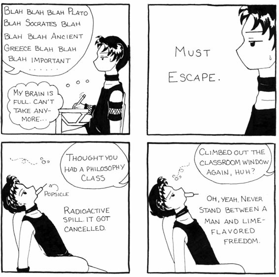 When I was still in high school I was both in charge of layout and responsible for the monthly comic. Actually, I didn't want to be the comic artist, but my editor/friend forced me into it. I decided to paste the little buggers on the Internet just so I could continue torturing people. Yay for me.
